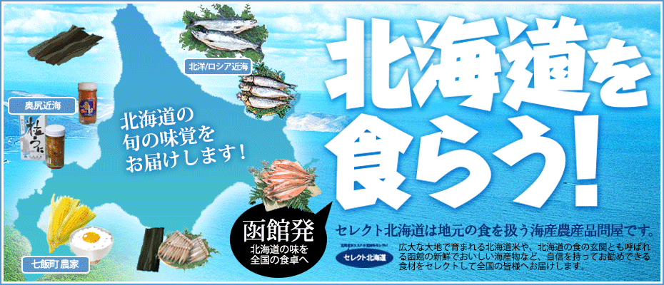セレクト北海道は、函館から海産物を中心にお届けする「函館酒の肴や」、昆布専門店の「函館梶原昆布店」など、北海道ならではの商品をご購入いただけるオンラインショップを運営しております。 特に夏のとうもろこし、冬の海産物は毎年ご好評をいただいております。 詳しくは右記のバナーより各サイトをご覧ください。